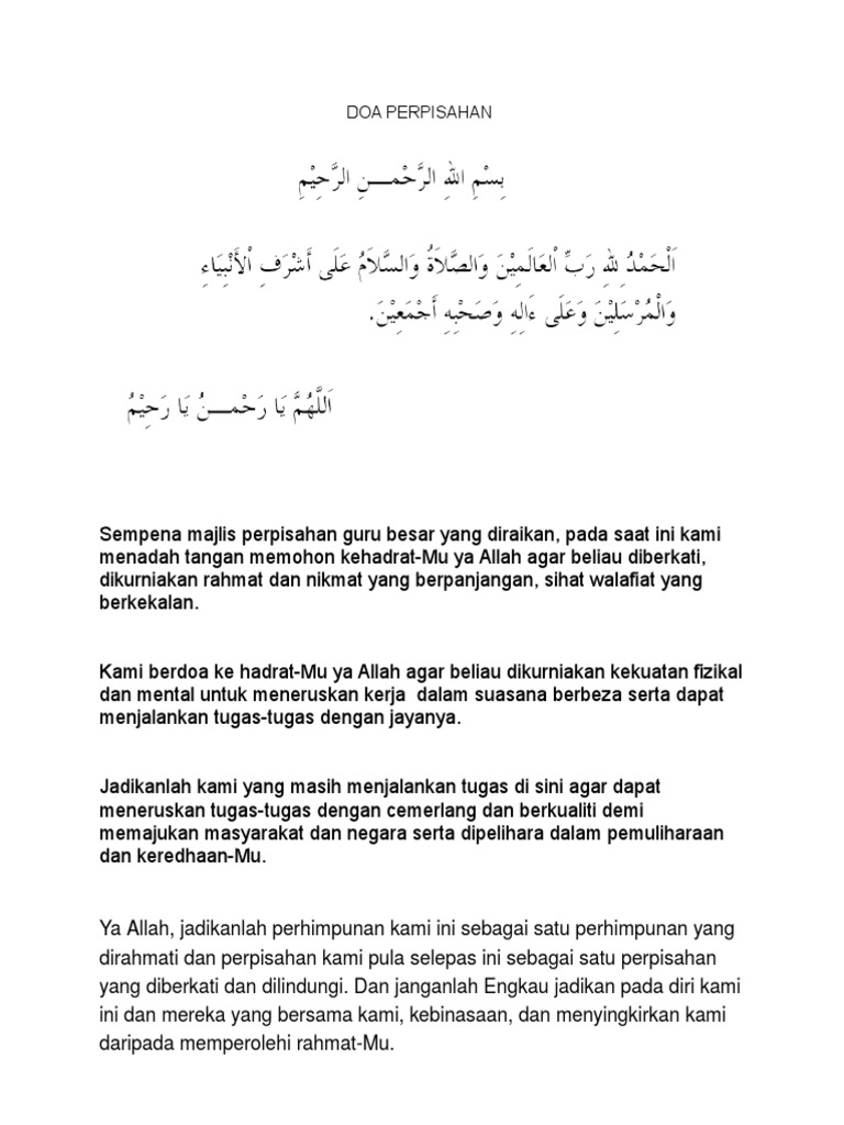 Doa Perpisahan Kakitangan from imgv2-2-f.scribdassets.com Rahmatilah majlis kami pada malam ini, tautkanlah ukhuwah kami, kuatkanlah silaturahim dalam. Doa an pegawai dan kakitangan. Salam, setiap daripada kita pasti akan ada majlis perpisahan selalunya majlis perpisahan kali pertama dalam hidup kita selalunya pada waktu menjadi zaman pelajar. Ya allah ya tuhan kami, jadikanlah pertemuan ini sebagai pertemuan. Ukuran kartu ucapan terima kasih souvenir o818 22 5376 whatsapp kartu souvenir pernikahan undangan Teks pengacara majlis majlis perpisahan jan 2018. Persaraan juga merupakan detik tamatnya perkhidmatan seseorang itu dengan majikannya. Tiap pertemuan pasti ada perpisahan itu adat, itu lumrah kehidupan begitulah rentetan perjalanan walau sukar untuk ditelan.